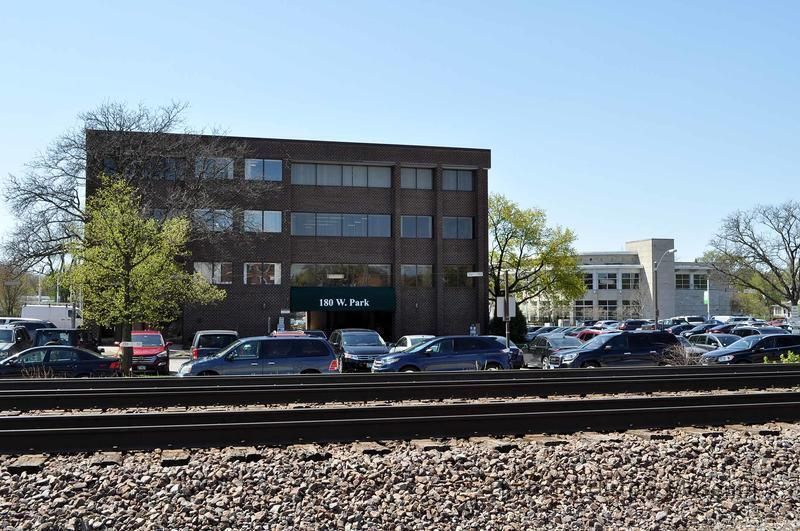 View of office building at 180 W. Park, looking south from First Street on the north side of the tracks. Elmhurst Public Library is visible in the background.Photograph Details
