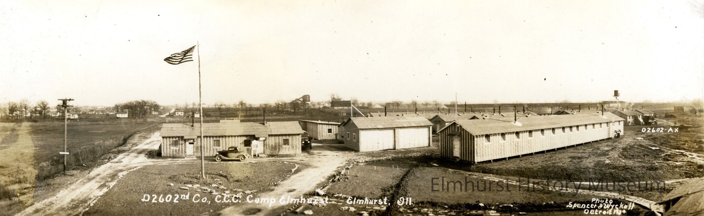 The handwritten caption is printed along the bottom in white "D2602nd Co., C.C.C. Camp Elmhurst Elmhurst, Ill." Printed in white in right hand corner is photographer credit "Photo / Spencer & Wyckoff / Detroit, Mic."