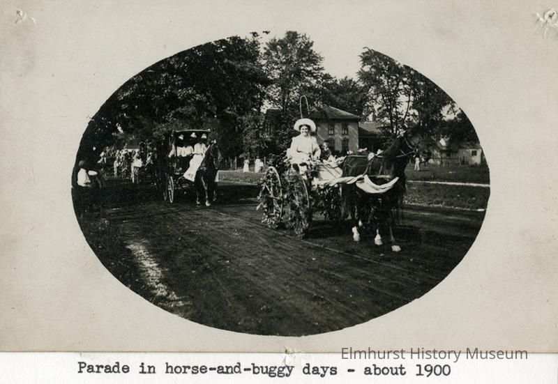 Penciled on back: Fourth of July Parade - Note Bells hanging in 2nd wagon S. on Addison- Geo Balgemann house Mrs Stange Driving Typed caption taped to back: Parade in horse-and-buggy days-about 1900