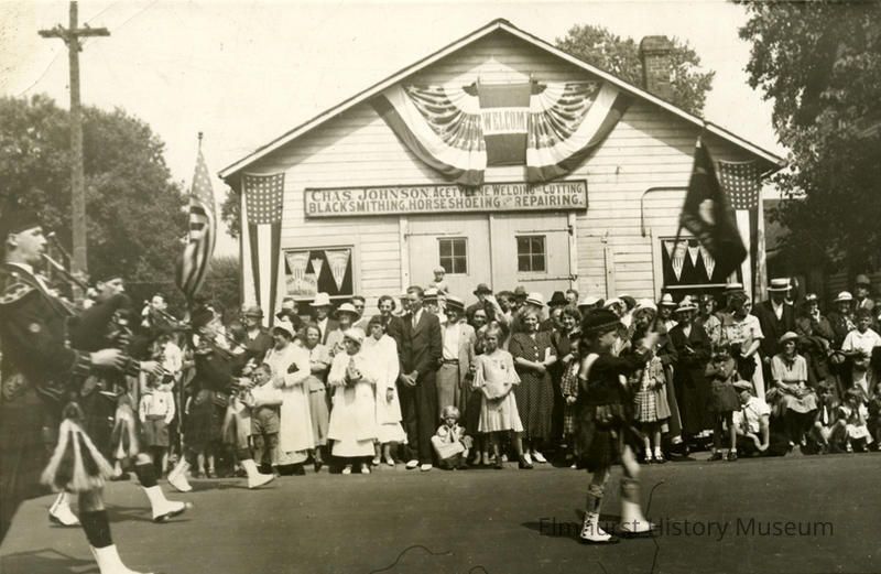 Unidentified parade on York Street, in front of the Charles Johnson Blacksmith Shop at the southeast corner of York and Schiller Streets.Photograph Details