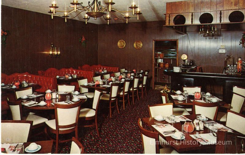 Paradise Restaurant and Lounge, an interior scene with dining tables, booths and a bar. Written in red ink on the back (probably by donor) is "Picture taken in 1963 when Rest. opened. Old Chambert Store and Olswanges Store 100 S. York St. York & Park - S.W. corner." Printed in black on the back is "Paradise Restaurant and Lounge 100 South York, Elmhurst, Illinois Phone:853-8009 / The newest and nicest restaurant in Elmhurst at / 100 S. York, across fromt he Elmhurst National Bank..." Photo Id is "Guy Carrol, Photography - Color Art, Elmhurst, Illinois 279-4520." Postcard is unused.Photograph Details
