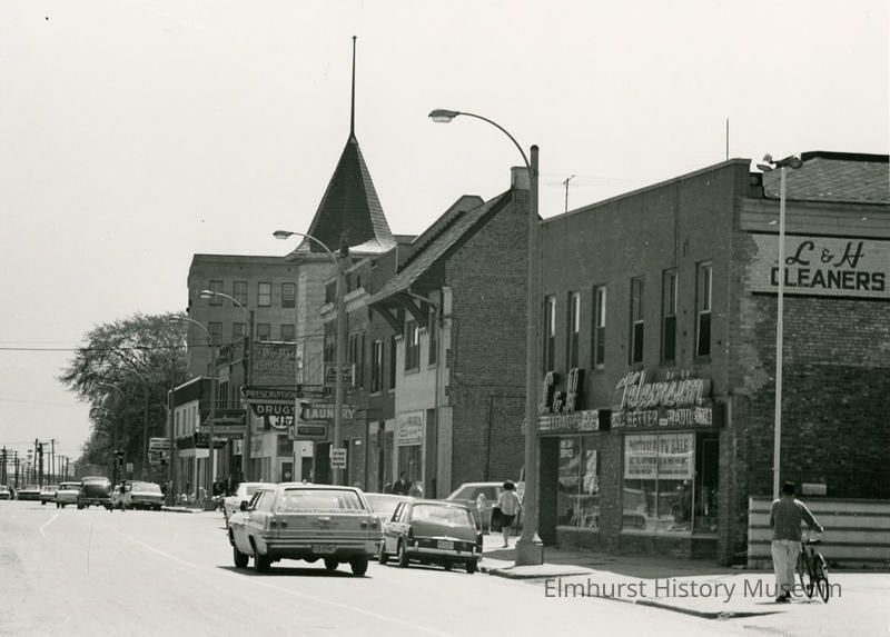 On back: Elmhurst-Business Sections / Park Av. East from Cottage Hill Av. / Taken May 21, 1966 by R.L. Mahon / Using Leica with 90mm lens / Roll 1, Frame 17 Panatomic X film / Elmhurst Public Library / Elmhurst, Ill