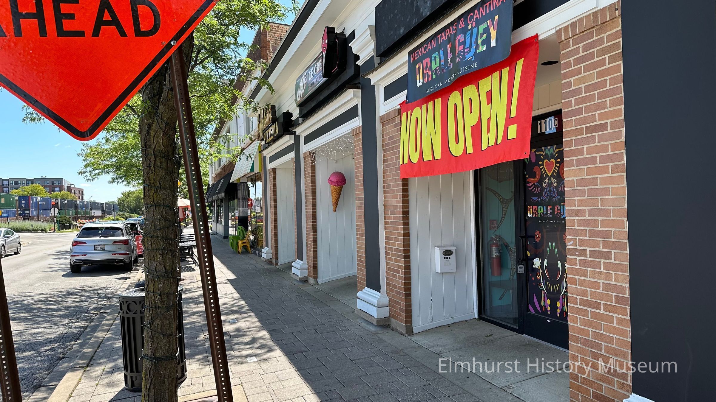 Shopfronts on W. Park Avenue, looking east towards S. York Street. Orale Guey restaurant at 110 W. Park Avenue is in the foreground.Photograph Details