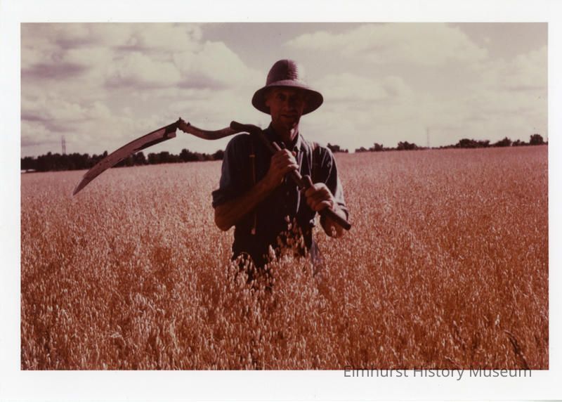 Paul Luessenhop holding a scythe in a field on his farm on the south side of Grand Avenue east of York RoadPhotograph Details
