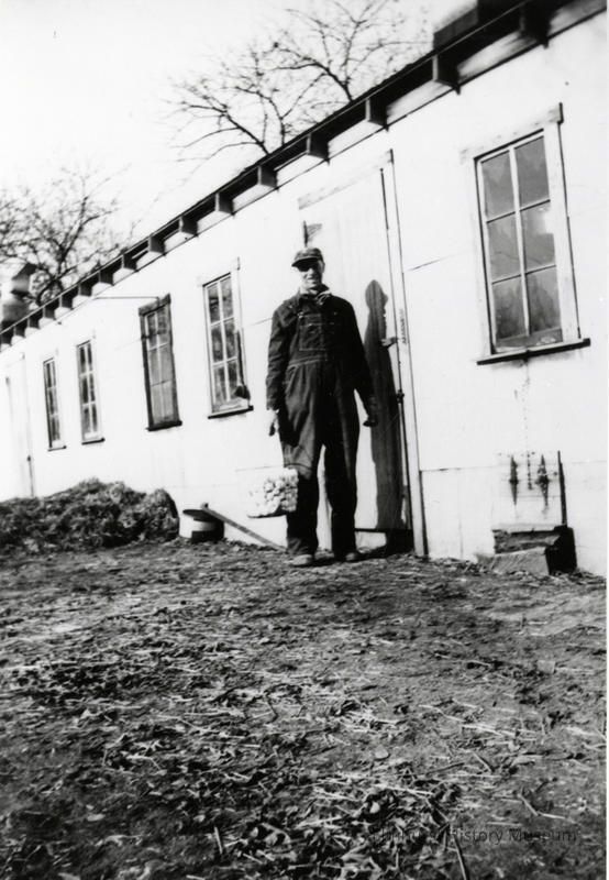 Paul Luessenhop standing outside the chicken coop on his farm, on the southeast corner of York Street and Grand AvenuePhotograph Details
