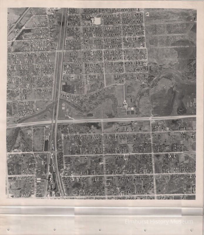 Black and white photograph, aerial view of Elmhurst Area--sheet 33 of bound volume. See M90.16.1 for placement on larger Elmhurst area map.Made/Created