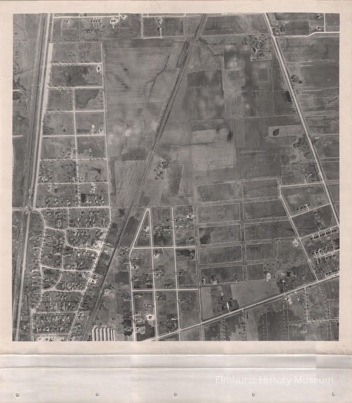 Black and white photograph, aerial view of Elmhurst Area--sheet 75 of bound volume. See M90.16.1 for placement on larger Elmhurst area map.Made/Created