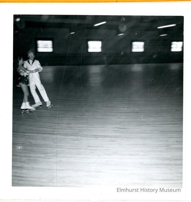 Black and white photo, skaters Randy Johnson and Sharon Rosenbach at a competition at the Elm Skate Rink at Roosevelt Road and Butterfield.