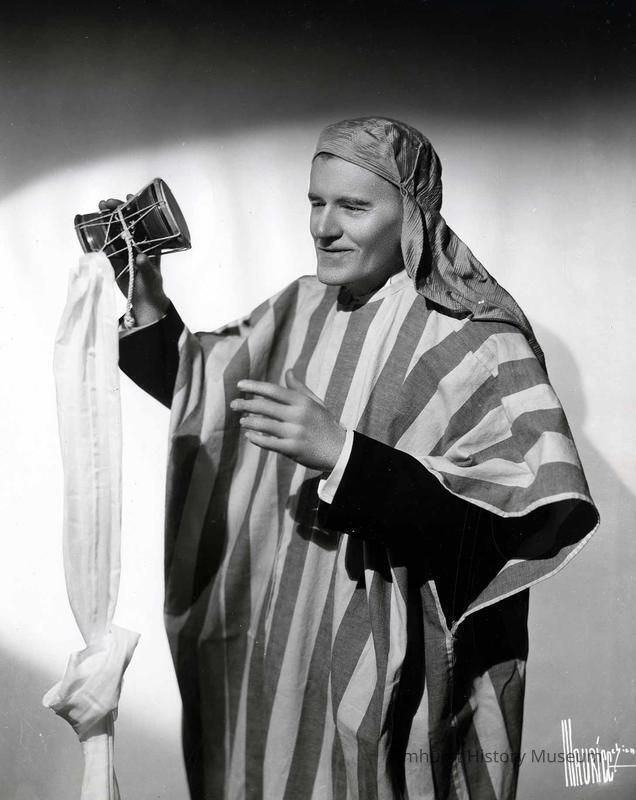 Black and white photograph of Dr. Harlan Tarbell, Elmhurst magician, dressed in a striped costume.
