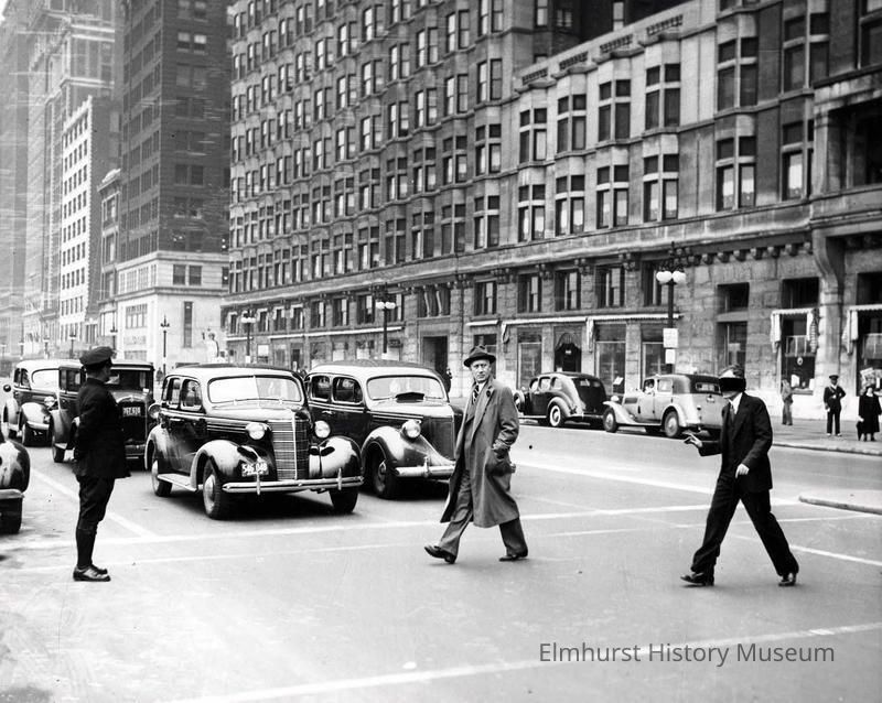 Black and white photograph of a blindfolded Dr. Harlan Tarbell, Elmhurst magician, walking across an urban street. Another man is also walking across the street while a policeman stands in the crosswalk.