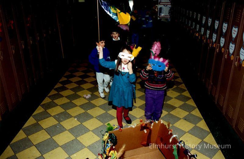 Children in costume march through the halls of IC Grade School at 132 Arthur St for a Mardi Gras paradePhotograph Details