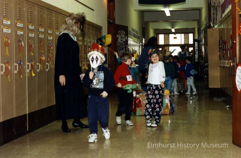 Children in costume march through the halls of IC Grade School at 132 Arthur St for a Mardi Gras paradePhotograph Details