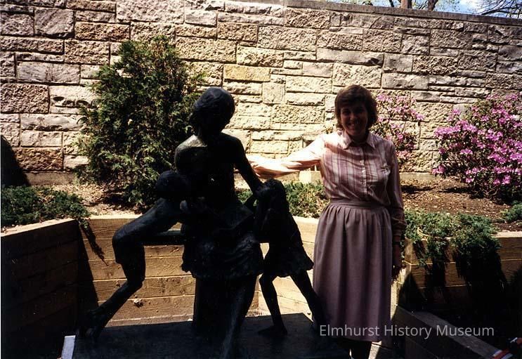 Librarian Judy Ekblad at the "once upon a time" sculpture outside the west facade of the Elmhurst Public Library.Photograph Details