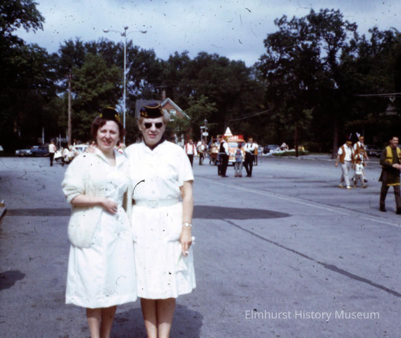 Digitized color slide, American Legion members at a ceremony at the Veterans Memorial in Wilder Park. Tail end of a parade is in the background.Photograph Details