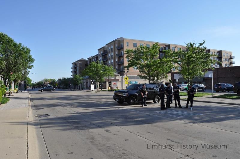 Police officers observe a the police brutality/ Black Lives Matter protest related to the killing of George Floyd by a police officer in Minnesota on May 25, 2020, held at the intersection of North Avenue and N. York Street.Photograph Details