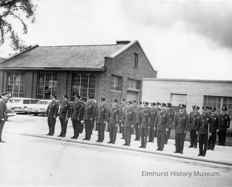 Note: According to "Elmhurst Police: Journey Through Time" book where this image appears on page 37, this is Mandatory Memorial Day Inspection on May 30, 1962 and the police officers are wearing new uniforms.