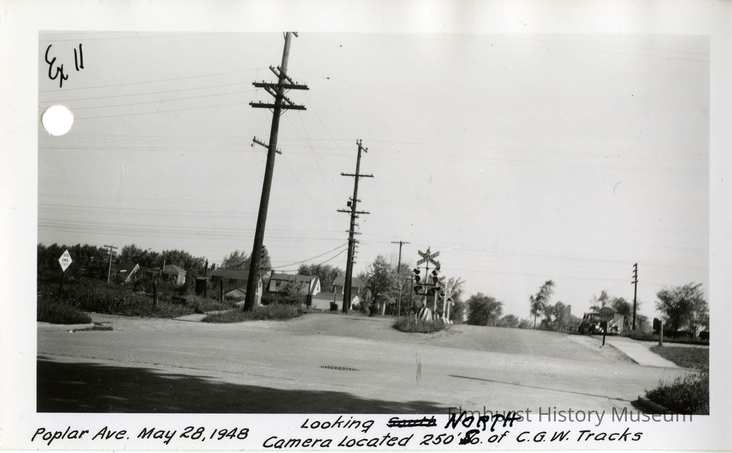 View of the Poplar Avenue railroad crossing, looking north towards the Chicago Great Western tracks. Photo was taken for the legal case "Illinois Commerce Commission v. Chicago Great Western Railway Company, Chicago Aurora and Elgin Railway Company, and the City of Elmhurst."Photograph Details