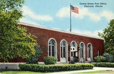 On front: United States Post Office / Elmhurst, Illinois / 9B385-N On back: Distributed by the J.O. Stoll Co. / Genuine Curteich-Chicago / CT American Art / Postcard (Reg. U.S. Pat Off.
