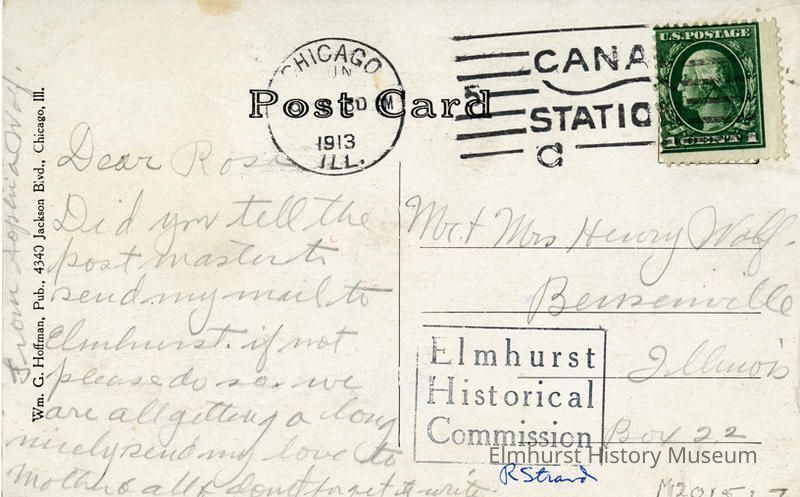 Stamped on back Elmhurst / Historical / Commission Publishing credit: Wm. G. Hoffman, Pub., 4340 jackson Blvd., Chicago, ILL Noted: R. Strand