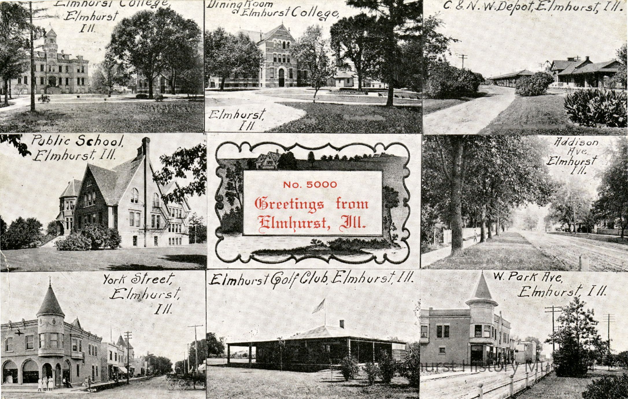 Eight images of Elmhurst scenes with identification. Sent from Sophia Wolf to Mr. and Mrs. Henry Wolf in Bensenville, IL.Photograph Details
