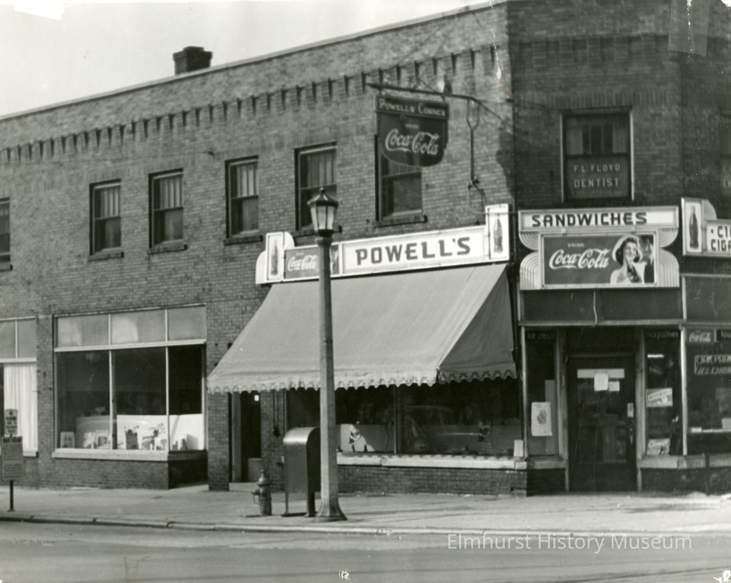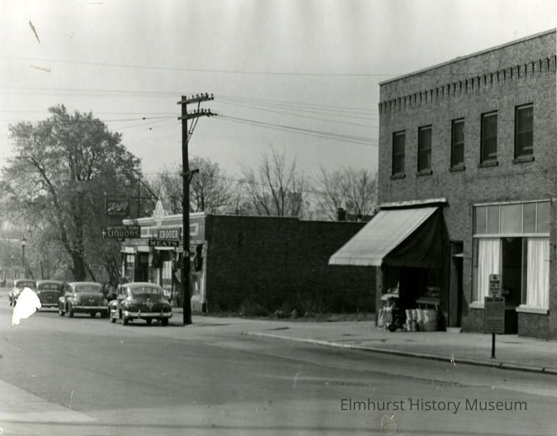 Two (2) black and white photographs of York Street: M88.15.17.1 View of west side of S. York Street looking south from Chicago Aurora & Elgin Railroad tracks to Vallette Street. Only one side of road is in the shot, with two brick store buildings in evidence with a vacant lot between. The closer building has no signage apparent, but the second building has "Liquors," "Meats," and "Kroger" signs readable on it. Four autos are parked in front of this building. An electric pole and lines are located between the buildings. M88.15.17.2 View of York Street south from Chicago Aurora & Elgin Railroad tracks to Vallette Street. Not much of the street is apparent. View is mainly a store building with corner store named "Powell's" with awning out over window facing York Street. Above the corner entrance is window with "Floyd, Dentist" sign. In front of this store are a street light, a mailbox and a fire hydrant.Photograph Details