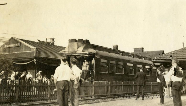 Toned photograph. Funeral train of President Warren G. Harding at Elmhurst Chicago and North Western Railroad station.Photograph Details