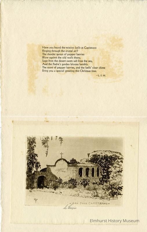Signature Christmas card format Upper part of card has poem and bottom part of card has print glued to it. in print, in LL 'Lee Sturges 1932' and in LR 'San Juan Capistrano' and in pencil in C margin 'Lee Sturges'