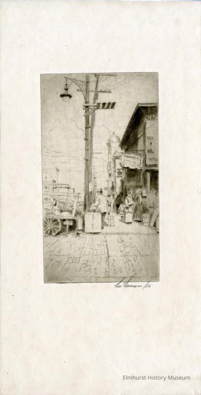 Print, etching on paper by Lee Sturges, UNTITLED (Street Corner with Merchants)Inscription/Signature/Marks