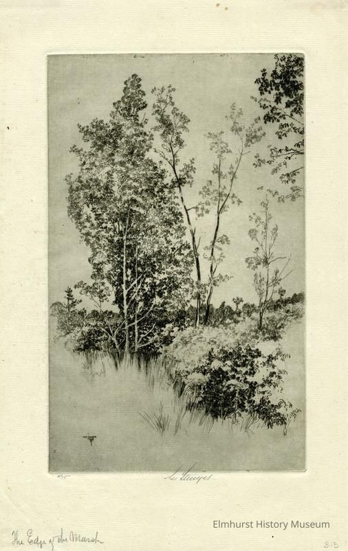 Inscription in LLC of paper in pencil ‘The Edge of the Marsh’ and in LRC at bottom of paper ‘313’ and in LLC below image in pencil 5/75’. Signature in LLC of image ‘Lee Sturges 1928’ and in margin in center of paper ‘Lee Sturges’. k ‘T ARCHIVES’. Signature in image in LLC ‘Lee Sturges 1928’ and in margin in LRC in pencil ‘Lee Sturges’.