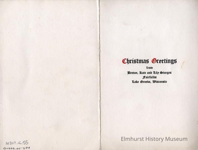 Signature Christmas card format: Print on one side and on other side in type 'Christmas Greetings from Benton, Kat and Lily Sturges, Fairfields, Lake Geneva, Wisconsin'
