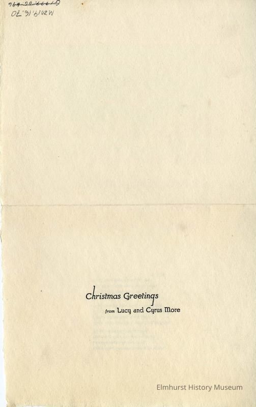 Signature in print in LL 'LS 32'; on upper part of paper is poem and at the bottom part of the paper is the print glued to the paper; on the back of the card in type 'Christmas Greetings from Lucy and Cyrus More'
