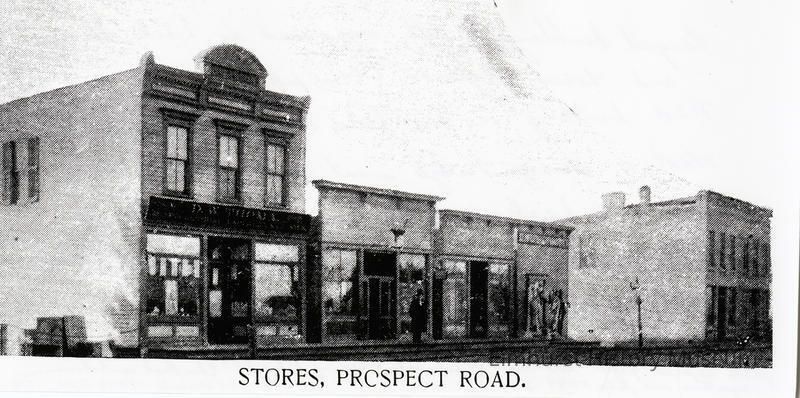 Prospect Road, now Park Avenue. Large building at left was owned by Dick Thema and Louis Balgemann. Dr. Bates' drugstore and post office, Henry Fritz's meat market, Tedrahn's groceries, Graue's grocery store, built 1864Photograph Details