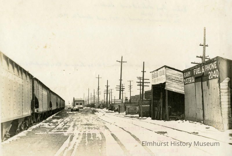 on back: Rahm Fuel, Material, and Stokers 520 S. York The Business opened c. 1927 and closed in 1942 Rec'd 10/79 from Omer Rahm -0N134 Leonard Rd 1, Winfield 60190 Looking west from York St.- showing switching tower and coal yard 520 S. York