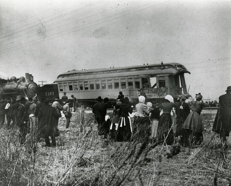 A crowd observing the aftermath of a rear-end collision involving the Buffalo Bill Show train on the Chicago & North Western line, one mile west of Melrose Park.Photograph Details