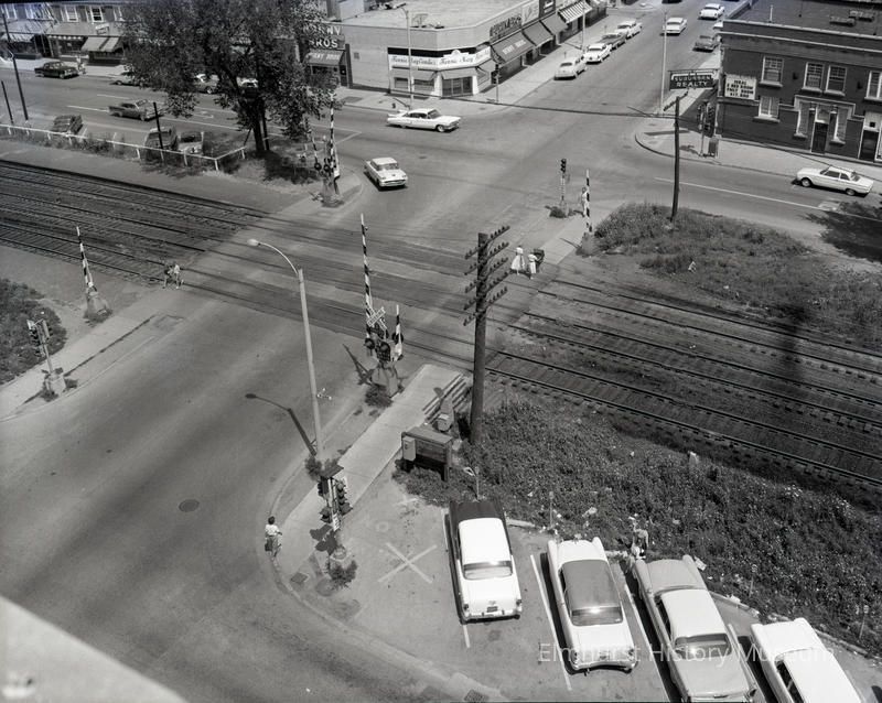 Railroad Crossing at York and First Streets. Businesses pictured include Suburban Realty, Fannie Mae Candies, and Burny Bros.Photograph Details