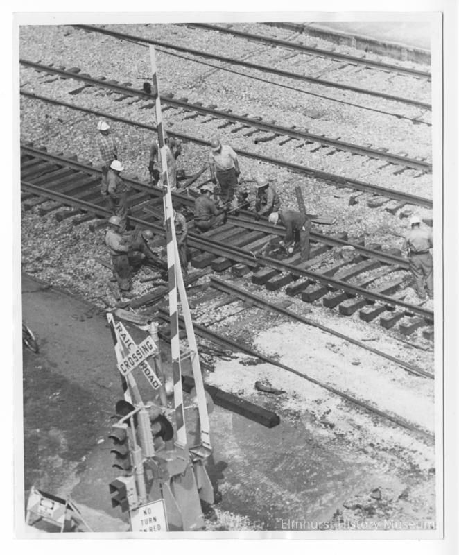 Aerial view of workers on the railroad tracks during underpass constructionPhotograph Details