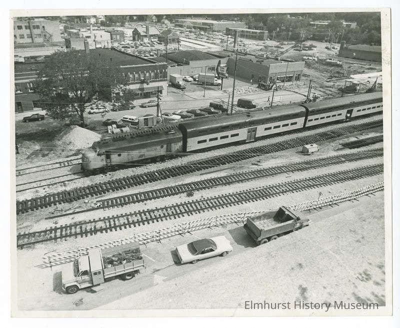 Railroad tracks during underpass construction. Photo was taken looking to the northeast. First Street, the back of the police/fire station and the Jewel store on Schiller are visible in the background.Photograph Details