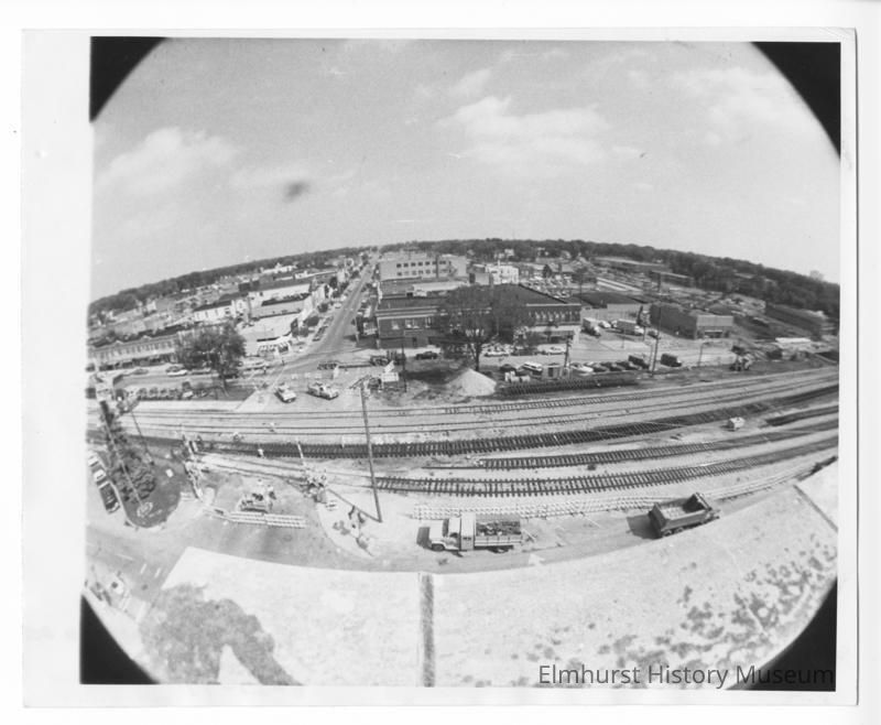Address label for "A J Engling" the donor and photographer is adhered to the back at the bottom. Handwritten notes are also on the back: "photo file-Underpass / Entry - Photo Contest Summer 1977" written in blue ink; "Fish eye of Elmhurst / 3 Track by Pass Abandoned / People at Work / York Park + 1st Business Dist / 8-27-77" written in black marker by the donor.