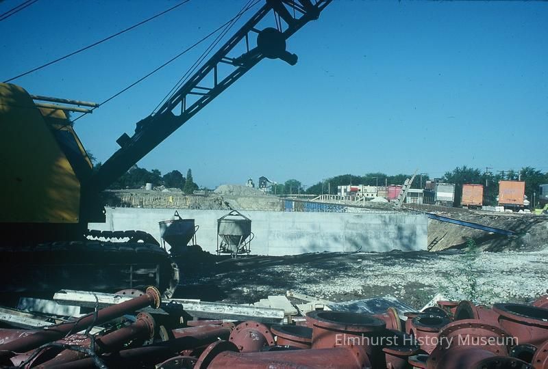 Construction of the reservoir, viewed from Myrtle Avenue and the Chicago North Western Railroad tracks, looking west.Photograph Details