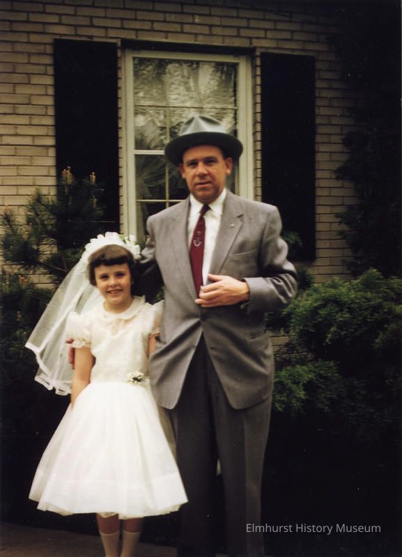 Betty Ann McCluskey in her First Communion dress posed with her father Robert E. McCloskey