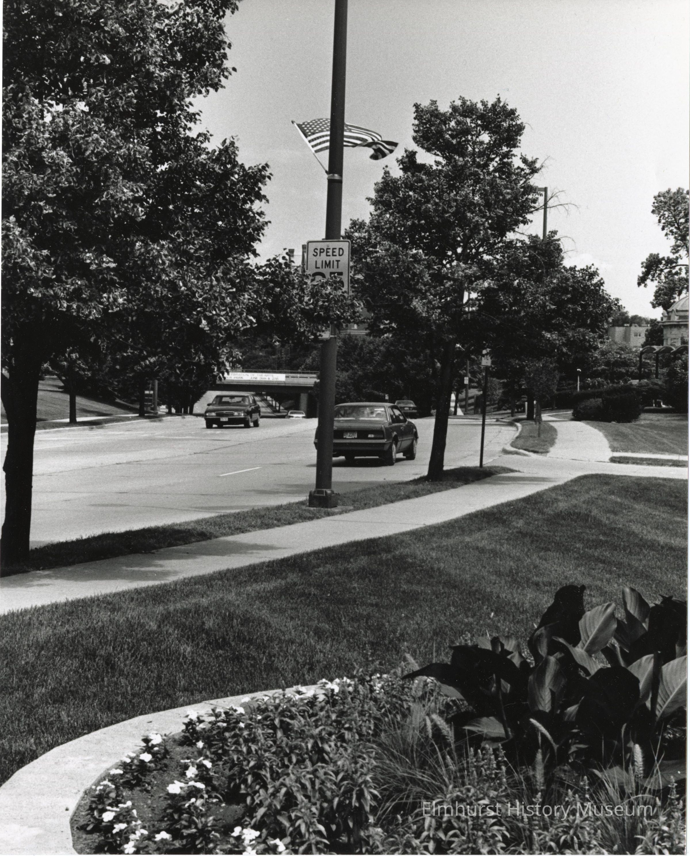 "Elmhurst Underpass- Robert Palmer Dr. looking N. from Parkway at S. Kenilworth Ave and Marion St. Juncture."
