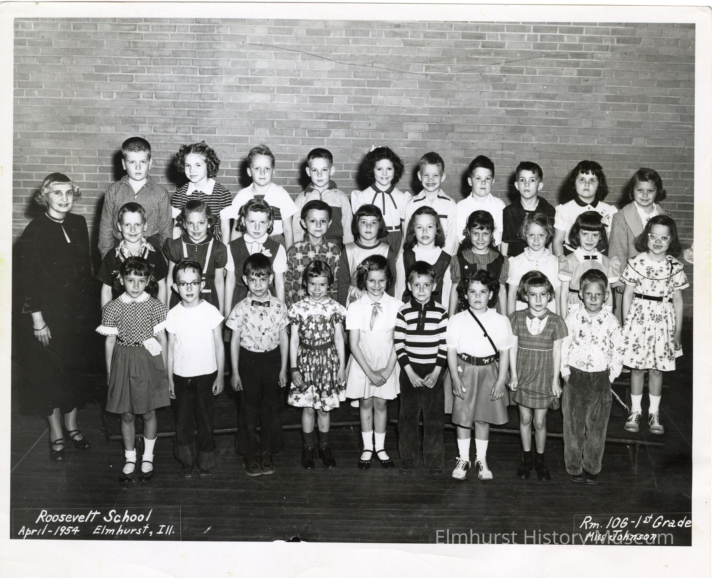 Class portrait of the first grade class at Roosevelt Elementary School under teacher Miss JohnsonPhotograph Details