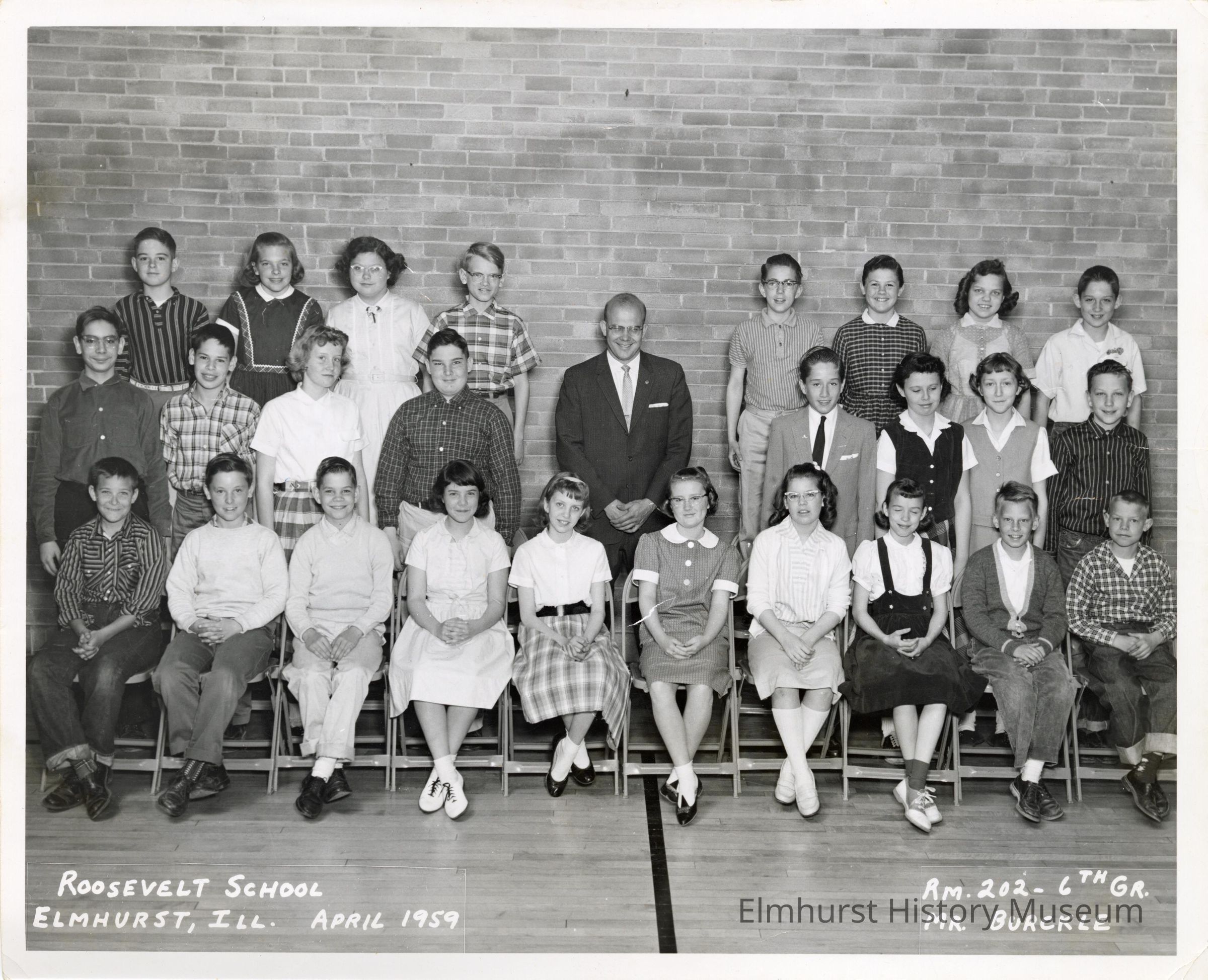 Class portrait of the sixth grade class at Roosevelt Elementary School under teacher Mr. Burckle.Photograph Details