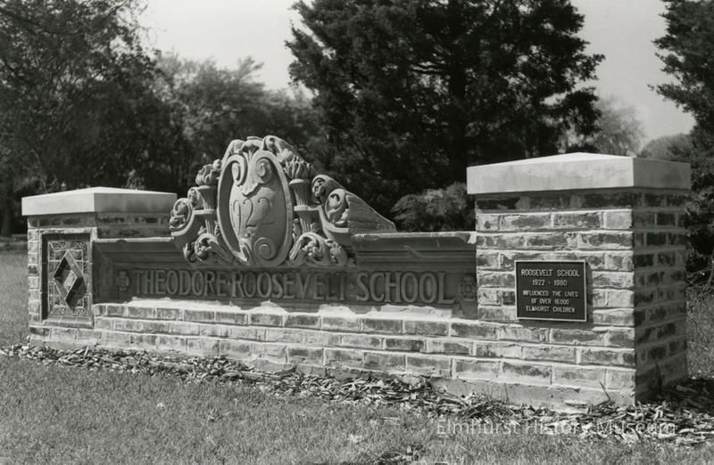 Architectural remnant reading "Theodore Roosevelt School" in Marjorie Davis Park. A plaque at right reads, Roosevelt School 1922-1980. Influenced the lives of over 16,000 Elmhurst Children."Photograph Details