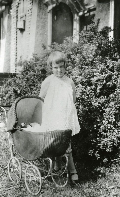 Young girl Ruth Hall, daughter of A. Neely Hall, posed with wicker doll buggy.