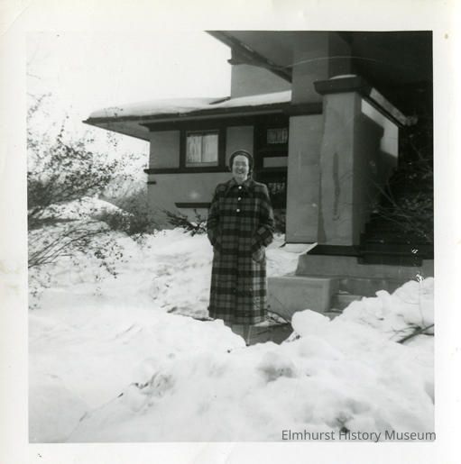 Ruth (Mrs. Chester) Shaffer in front of her home at 301 S. Kenilworth Avenue. The house was designed by Frank Lloyd Wright and H. Webster Tomlinson.Photograph Details