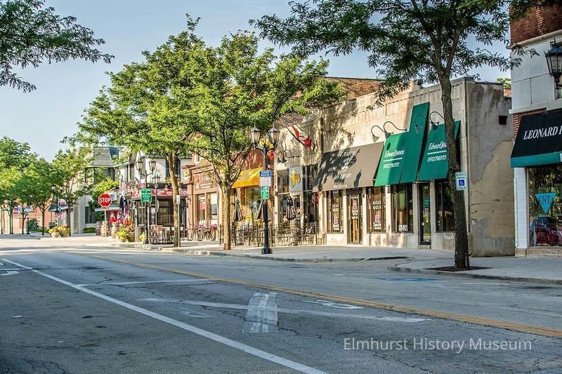 S. York Street looking southwest from Park Avenue. Pictured businesses include Cottage Hill Station restaurant and bar, Fulla Bologna deli, Pints restaurant and bar, Guac and Taco restaurant, Edward Jones investments, and Essential Skin & Beauty Salon.Photograph Details