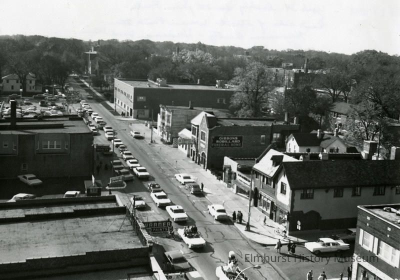Stamped in back upper left corner: Oct 17 1964 Stamped on back: Elmhurst / historical / Commission Pencilled on back: Parade, 1964. York St. looking south from Park / East side of York - Warner Paint Store, Heineman Realty, Heineman Food Store, Roesch Motors, Eagans Standard Service station / West side of street - Bican Bookshop, Delorimer Tot Shop, Gibbons-Robillard Funeral Home, Stemple's Bike Shop, Bell Telephone office