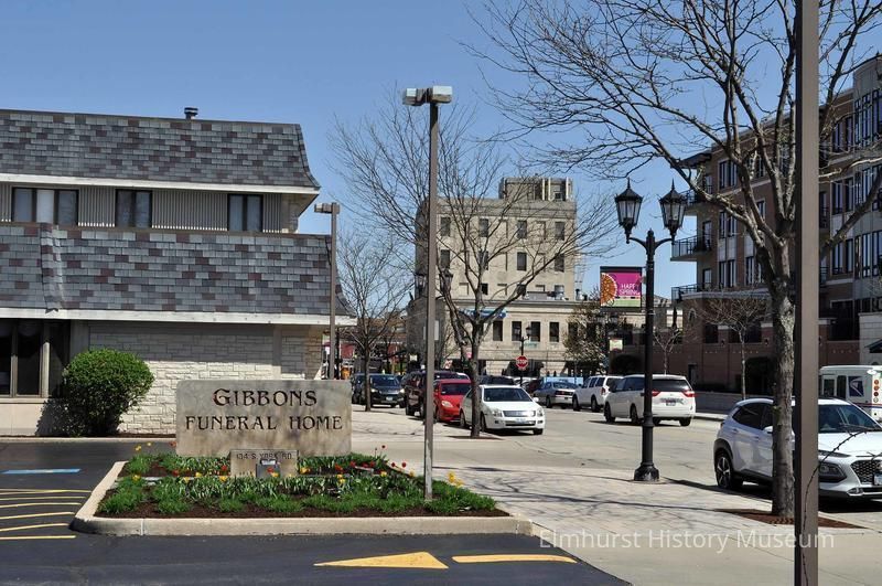 S. York Street looking north from Virginia Street. Pictured businesses include Gibbons funeral home at 134 S. York and the Fifth Third Bank building at 105 S. York.Photograph Details