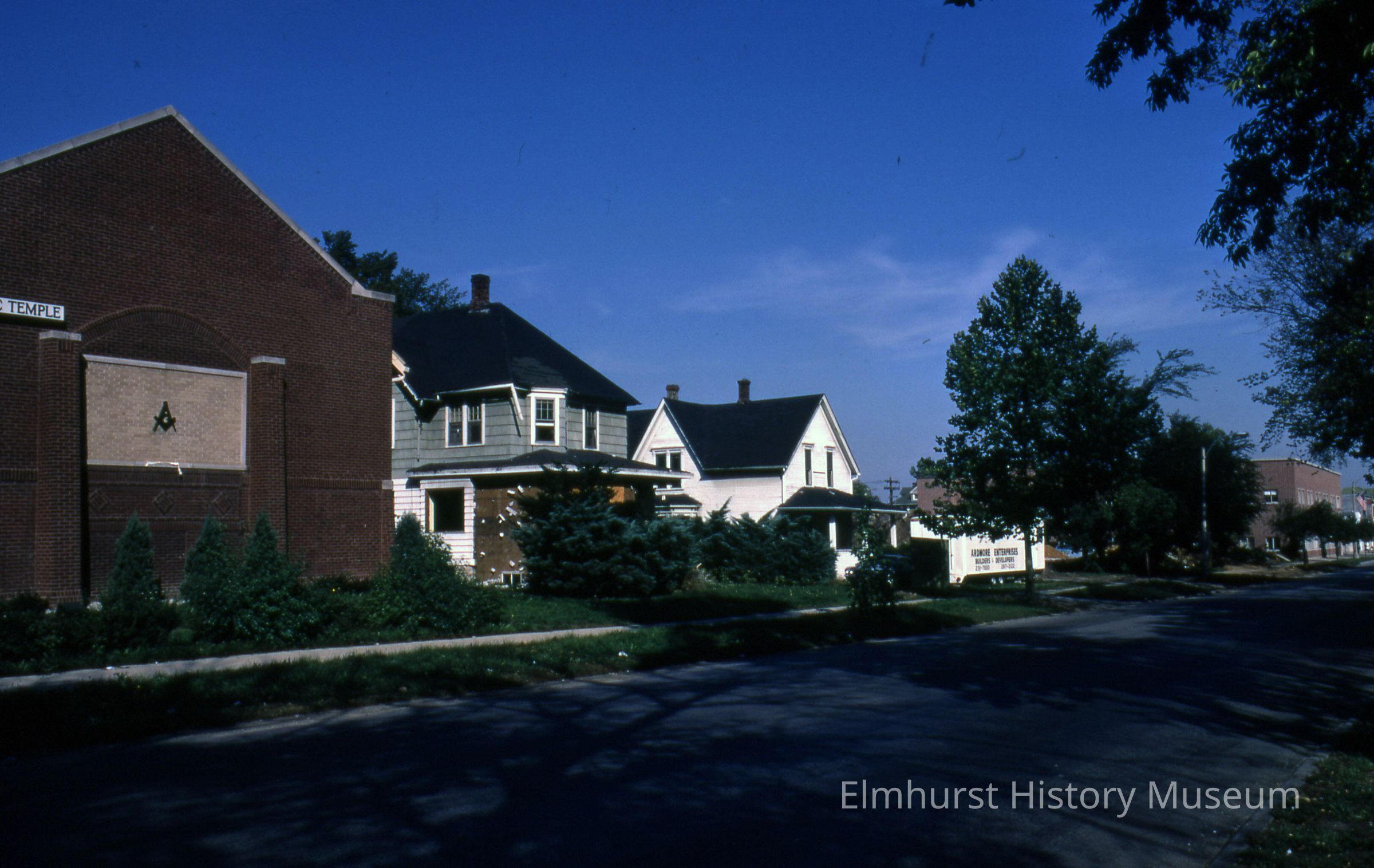 S. York Street looking north from Arthur. The Masonic Temple at 103 Arthur Street is at left, and the Illinois Bell Telephone building at 162 S. York is at right.Photograph Details